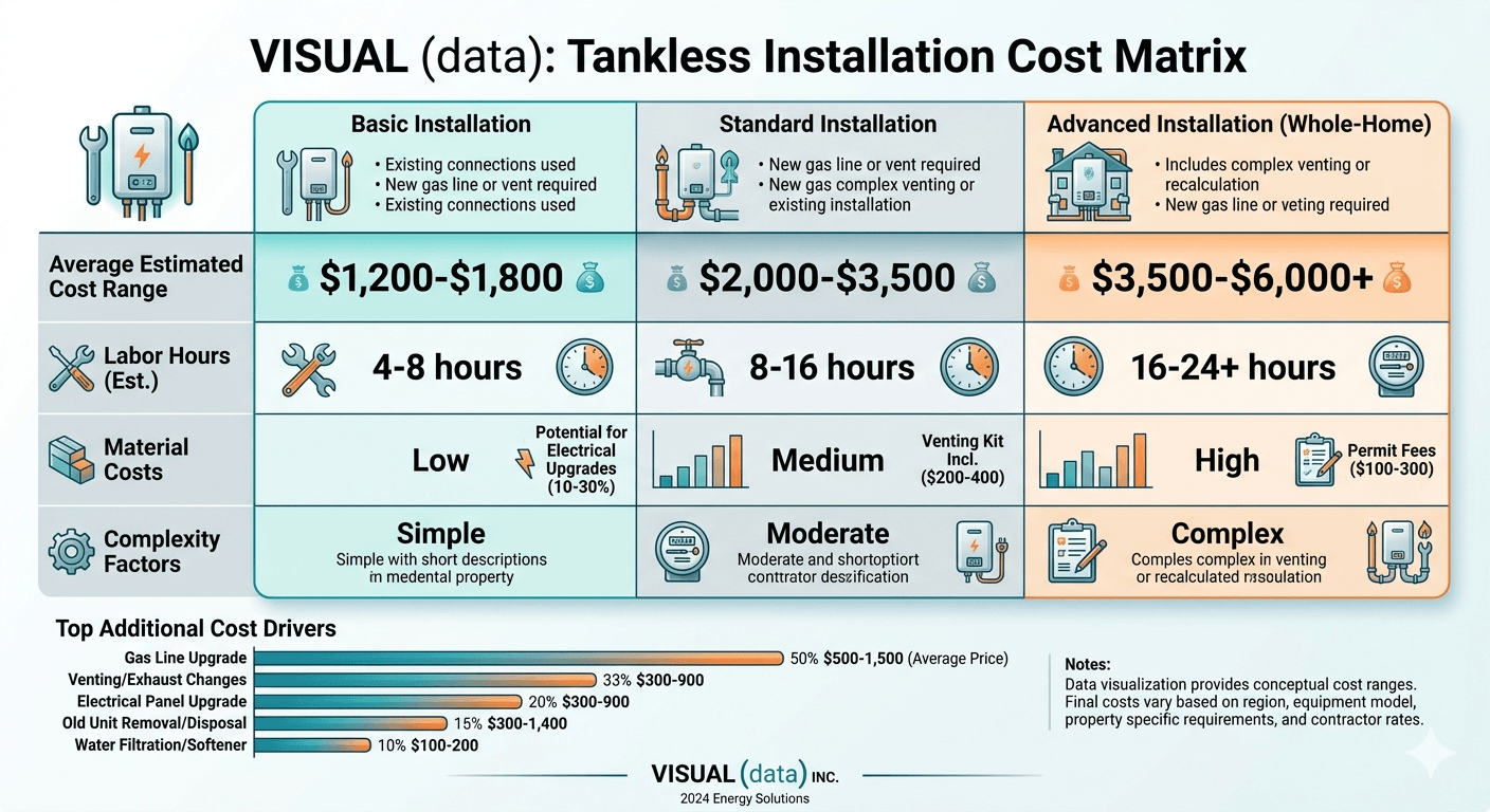 The required investment is dictated by existing infrastructure. If a home was not designed for on-demand heating, the "hidden" costs of upgrading an electrical panel or gas line often exceed the price of the unit itself.