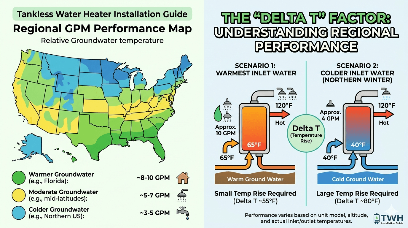 The "Delta T" Factor: Why a unit rated for 10 GPM in Florida might only deliver 4 GPM during a cold snap in the North.